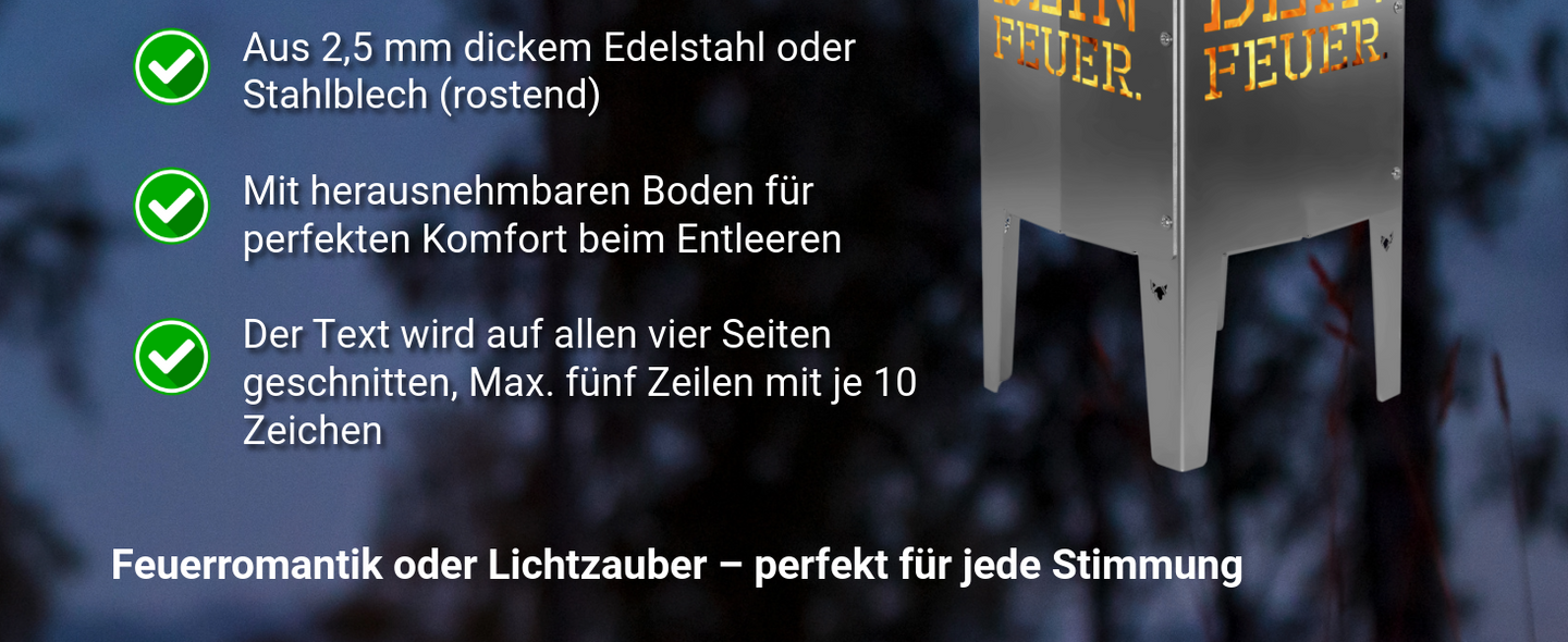 Ja, die Feuersäule kann auch ohne Feuer genutzt werden. Mit einem LED-Strahler, Plexiglas und den passenden Klemmen (Plexiglas und Klemmen bald im Set erhältlich) lässt sich ein dekoratives Licht erzeugen, sodass auch ohne Flammen eine stimmungsvolle Atmosphäre entsteht – ideal für Bereiche, in denen kein offenes Feuer erlaubt ist.