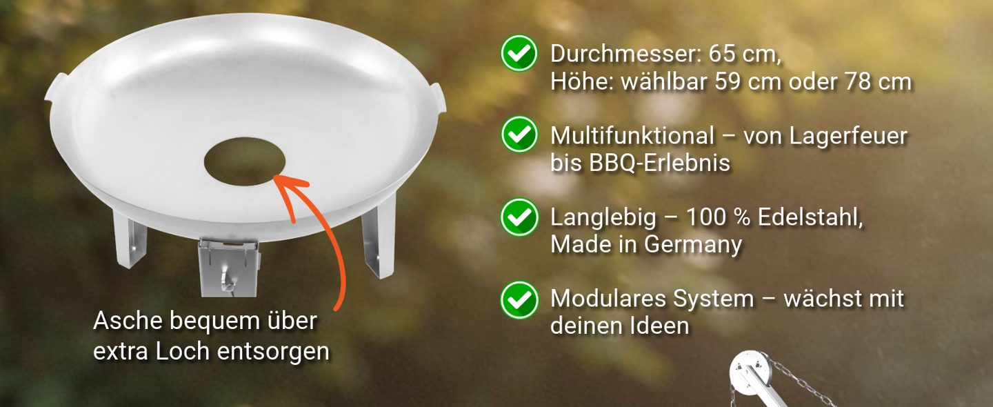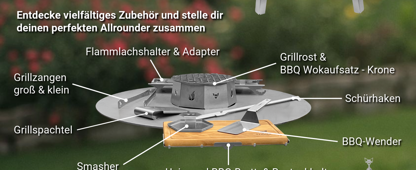 Ja! Sie lässt sich problemlos nach deinen Wünschen erweitern: Von Flammlachs über Schwenkgrill und Feuerplatte bis hin zu weiterem Zubehör. Alle Zubehörteile & Erweiterungen kannst du ohne Werkzeug anbringen. So wird deine Feuerschale ganz einfach zum vielseitigen Allrounder.