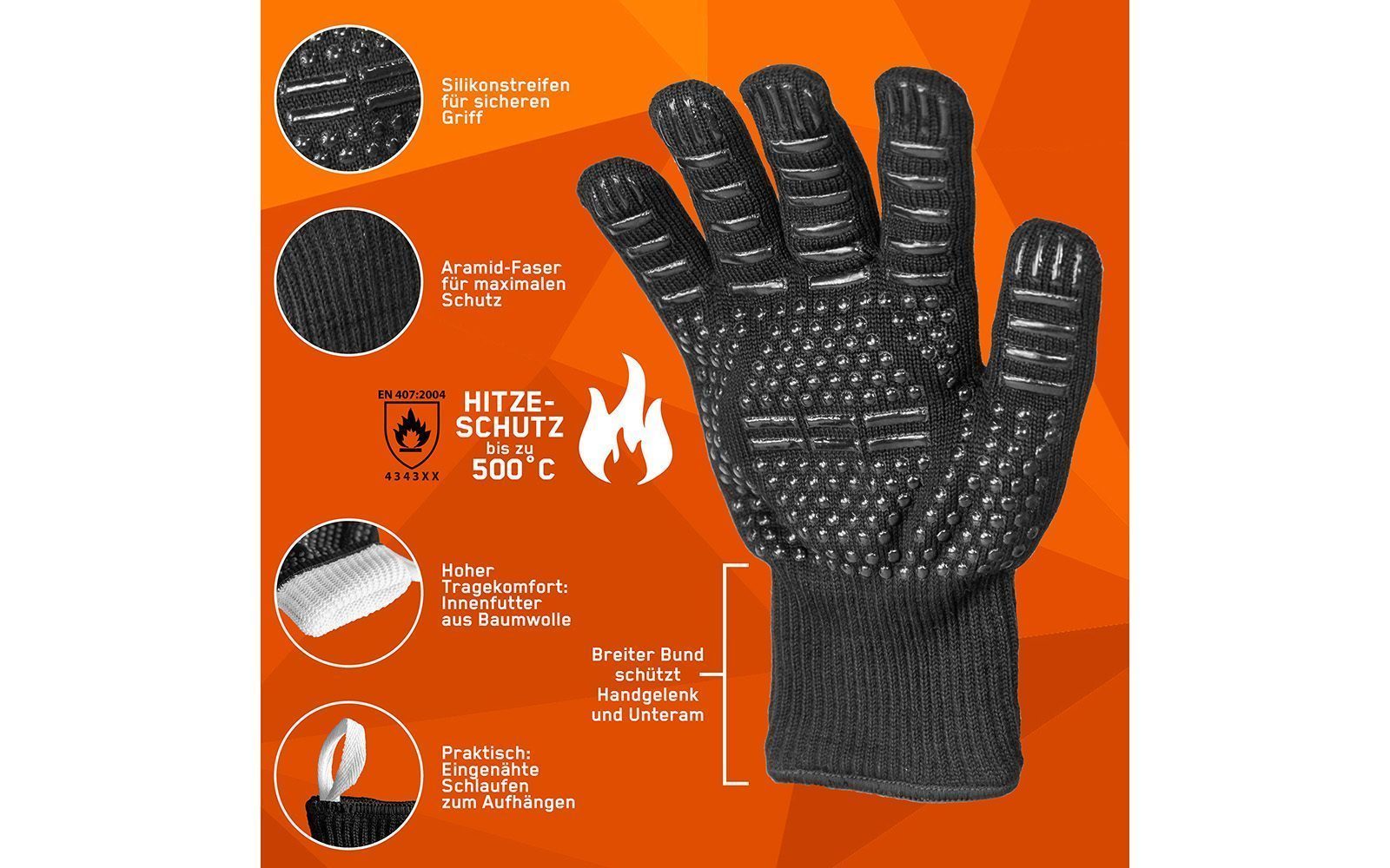 Durch die Aramidfasern verfügen die Grillhandschuhe über einen Hitzeschutz bis zu 500 °C (932 °F). Somit sind die Grillhandschuhe perfekt, um deine Hände vor hoher Hitze beim Grillen zu schützen.