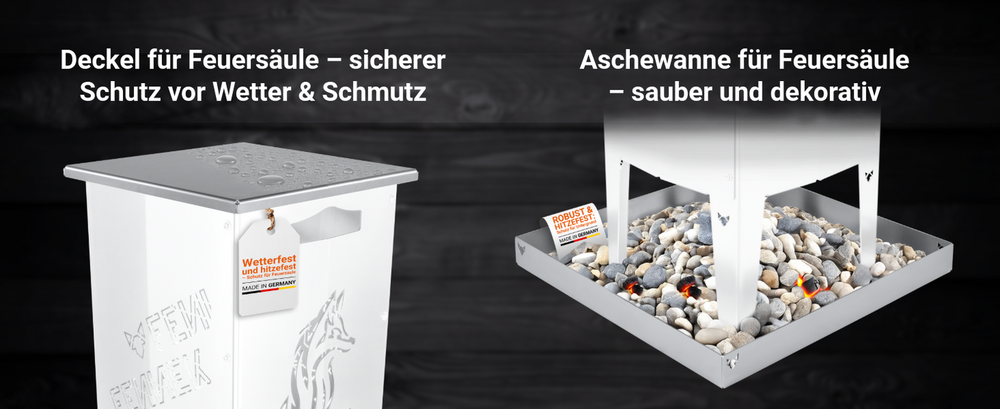 Die Feuersäulen sind für den Outdoor-Einsatz ausgelegt. Bei starkem Regen oder längerer Nichtbenutzung empfiehlt sich jedoch eine Abdeckung, um die Lebensdauer zu verlängern.