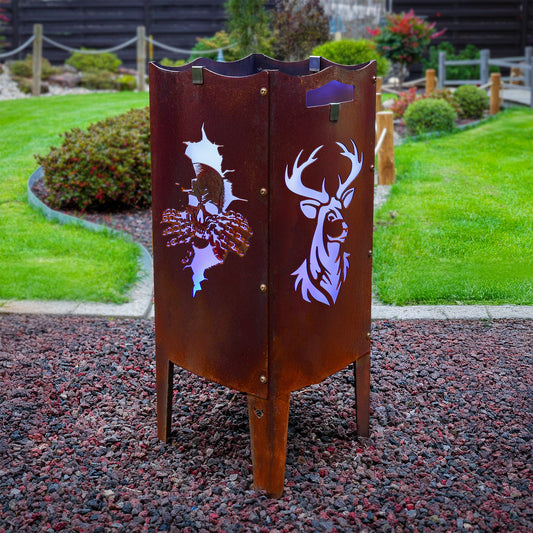 Die FENNEK Feuersäule lässt ich zum einen mit Holz befeuern oder mit LED Lichtern in verschiedenen Farben zum Leuchten bringen. Beide Varianten sorgen für ein stimmungsvolles Bild.