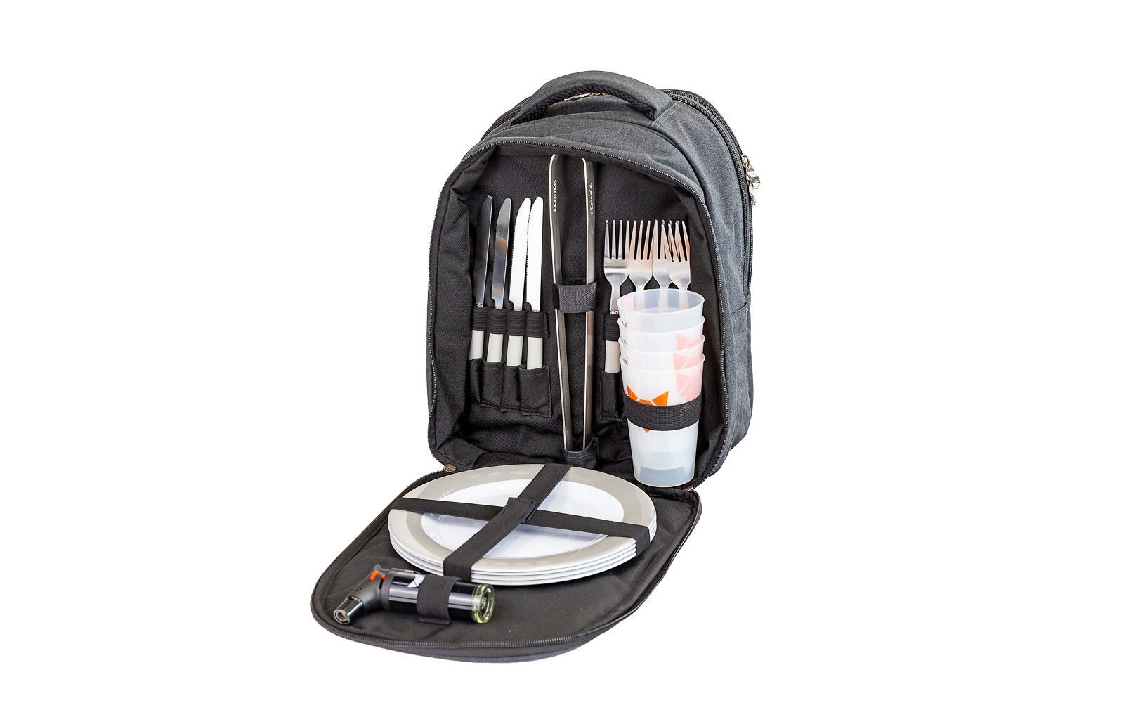 You will find the place setting in the front compartment of theBackpacks. It consists of 4 plates, 4Cups, 4 knives and 4 forks as well as a high-qualityFENNEK Grill tongs. In addition, theBackpackand thatStorm lighterSo you are perfectly equipped for hungry mouths on the go.