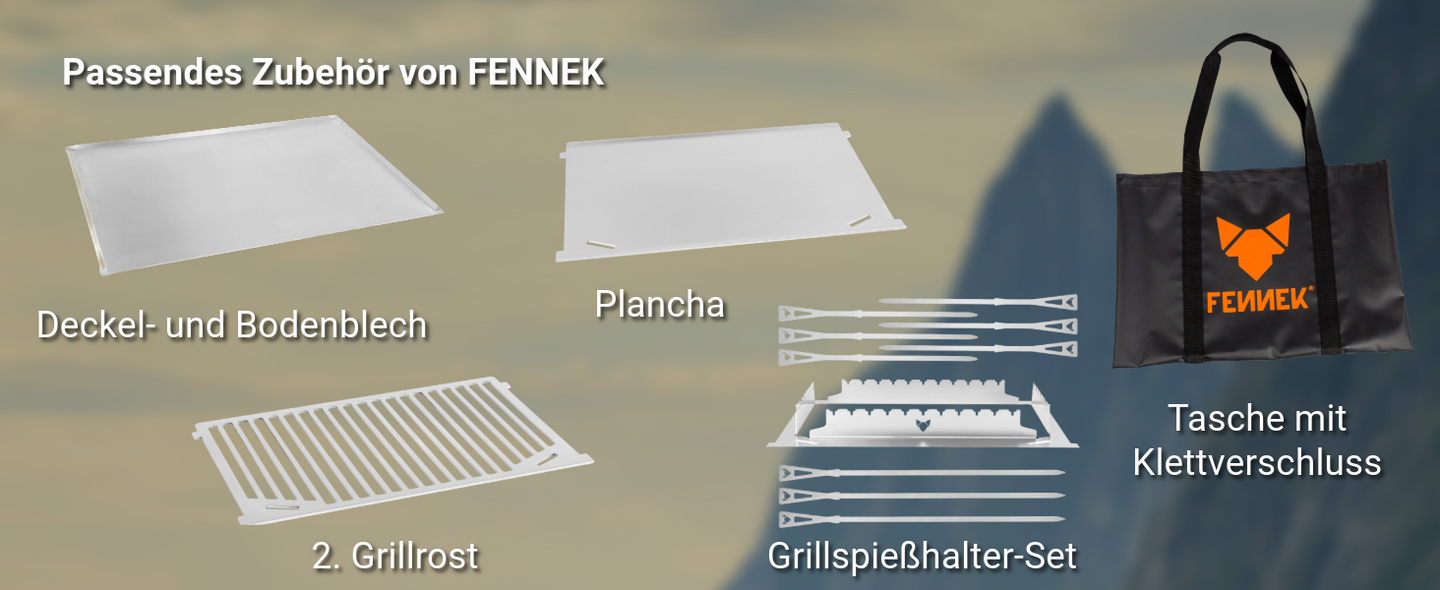 Zum FENNEK 2.0 gibt es weiteres optionales Zubehör wie einen 2. Grillrost, das Deckel- und Bodenblech, die Plancha und das Grillspießhalter-Set.