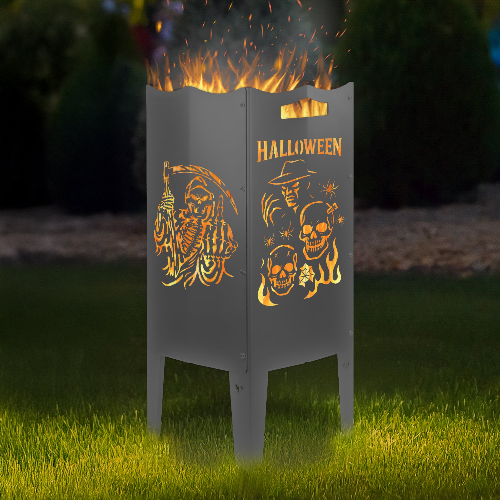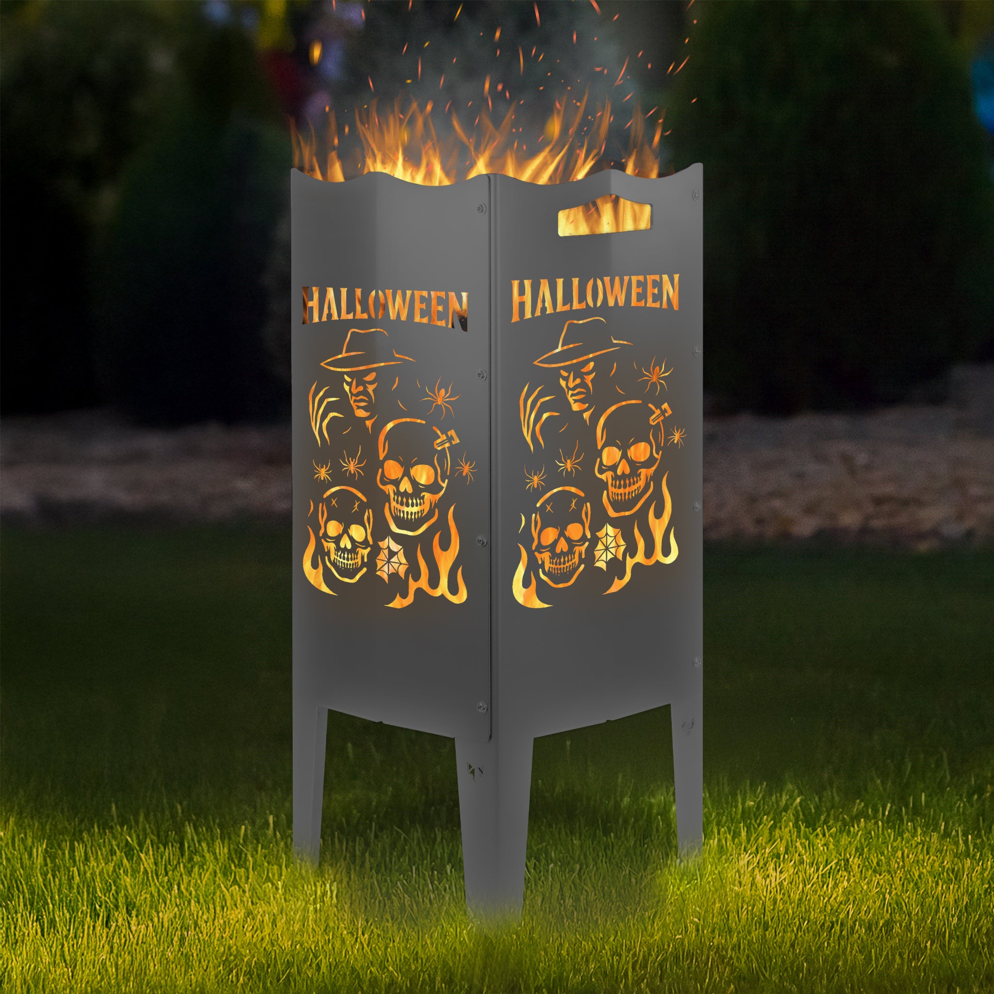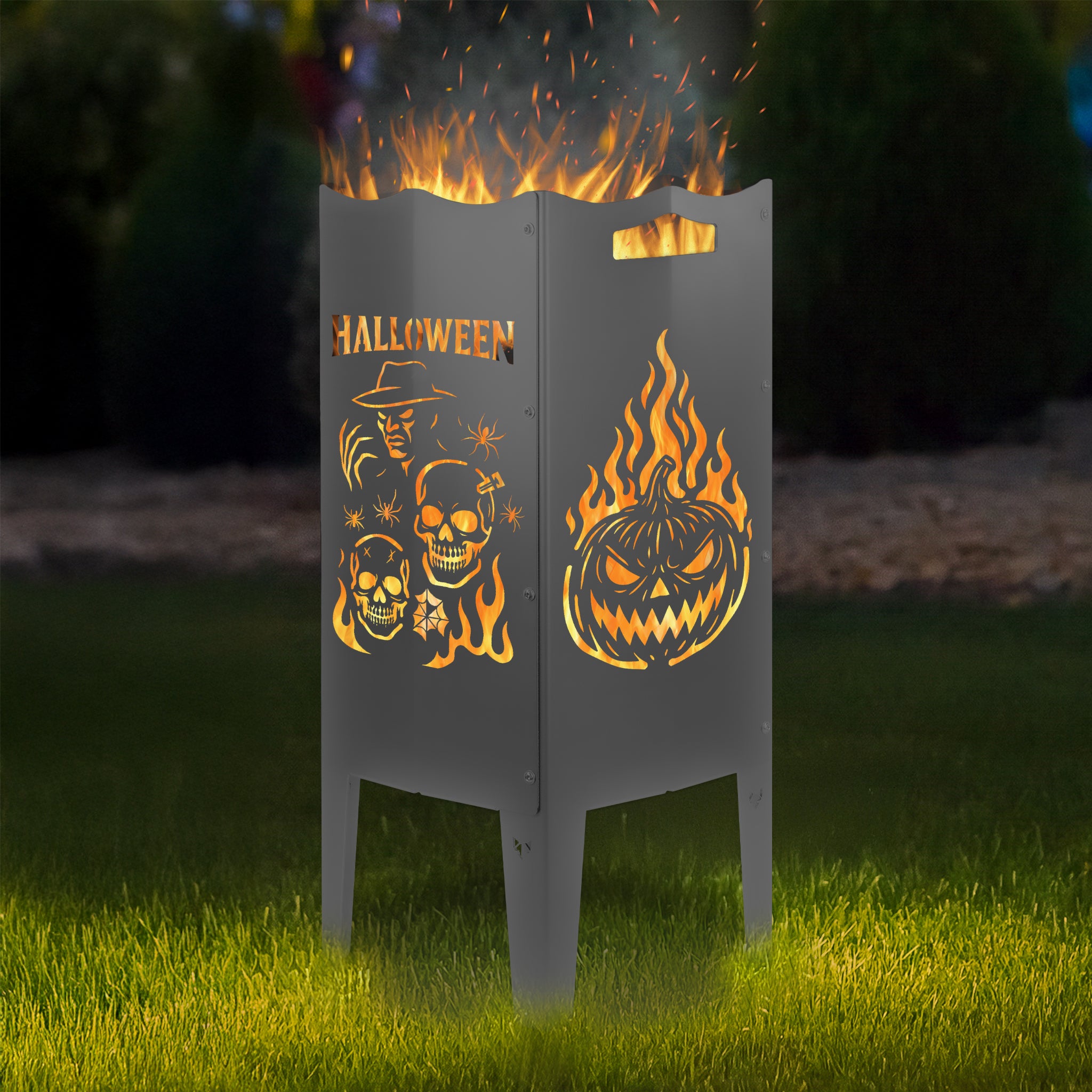Wähle aus 6 exklusiven Halloween-Motiven und gestalte deine Feuersäule nach deinem Geschmack. Du entscheidest, ob alle vier Seiten dasselbe Motiv zeigen oder ob du zwei Motive kombinierst. So wird deine Feuersäule garantiert zum Mittelpunkt deines Gartens – als Feuerkorb und Feuerstelle für stimmungsvolle Lagerfeuer-Abende.
