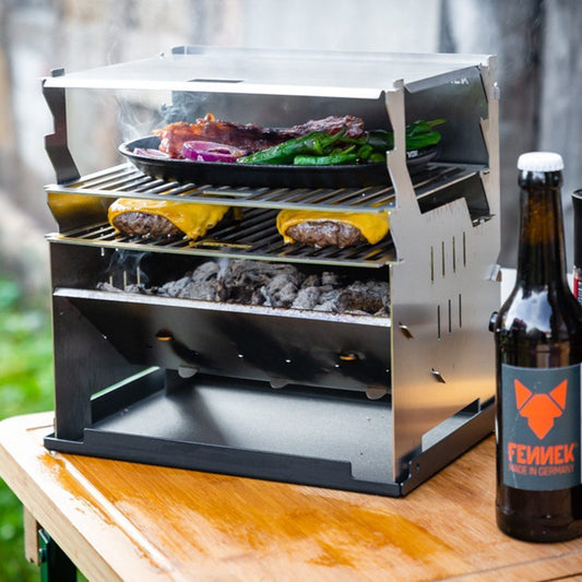 Dank seines einzigartigen Designs kann der FENNEK Grill auch als Tischgrill verwendet werden und eignet sich somit perfekt für die Zubereitung köstlicher Mahlzeiten während du die freie Natur genießt.
