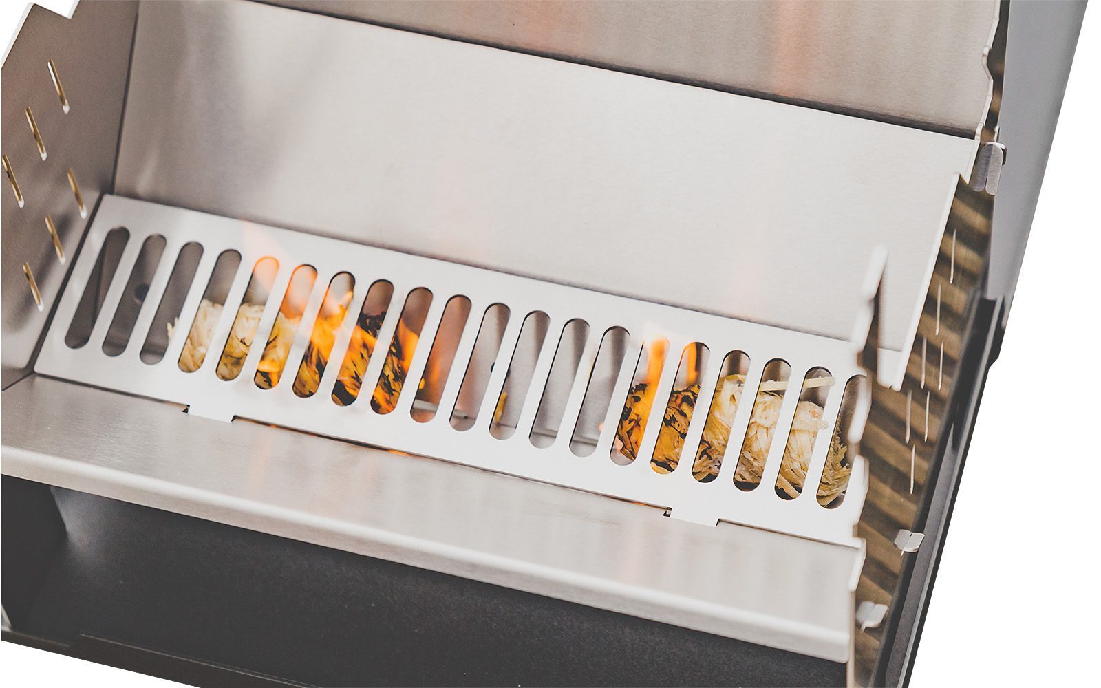 Dank seiner kompakten Größe lässt er sich leicht aufstellen und transportieren. Das abnehmbare Deckelblech schützt das Grillgut bei Wind oder kann als Wärmereflektor eingesetzt werden.