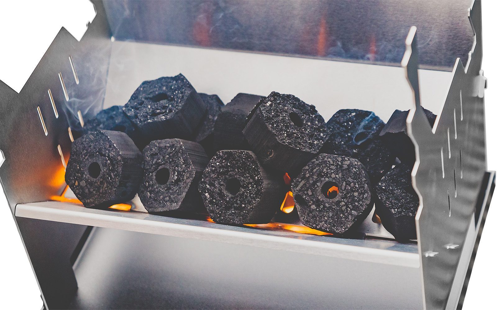 Aufgebaut in weniger als 1 Minute. In maximal 15 Minuten fertige Glut. Dank der cleveren Bauweise und des integrierten Kohlekamins kein Problem.