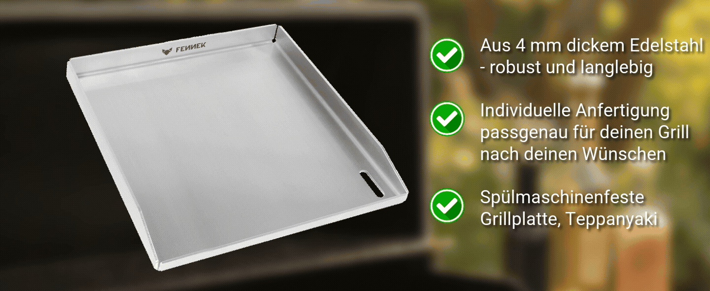 Entdecke die individuelle FENNEK Plancha aus lebensmittelechtem Edelstahl – wähle Maße und Features selbst und erlebe grenzenlose Möglichkeiten für unvergessliche Grillmomente!